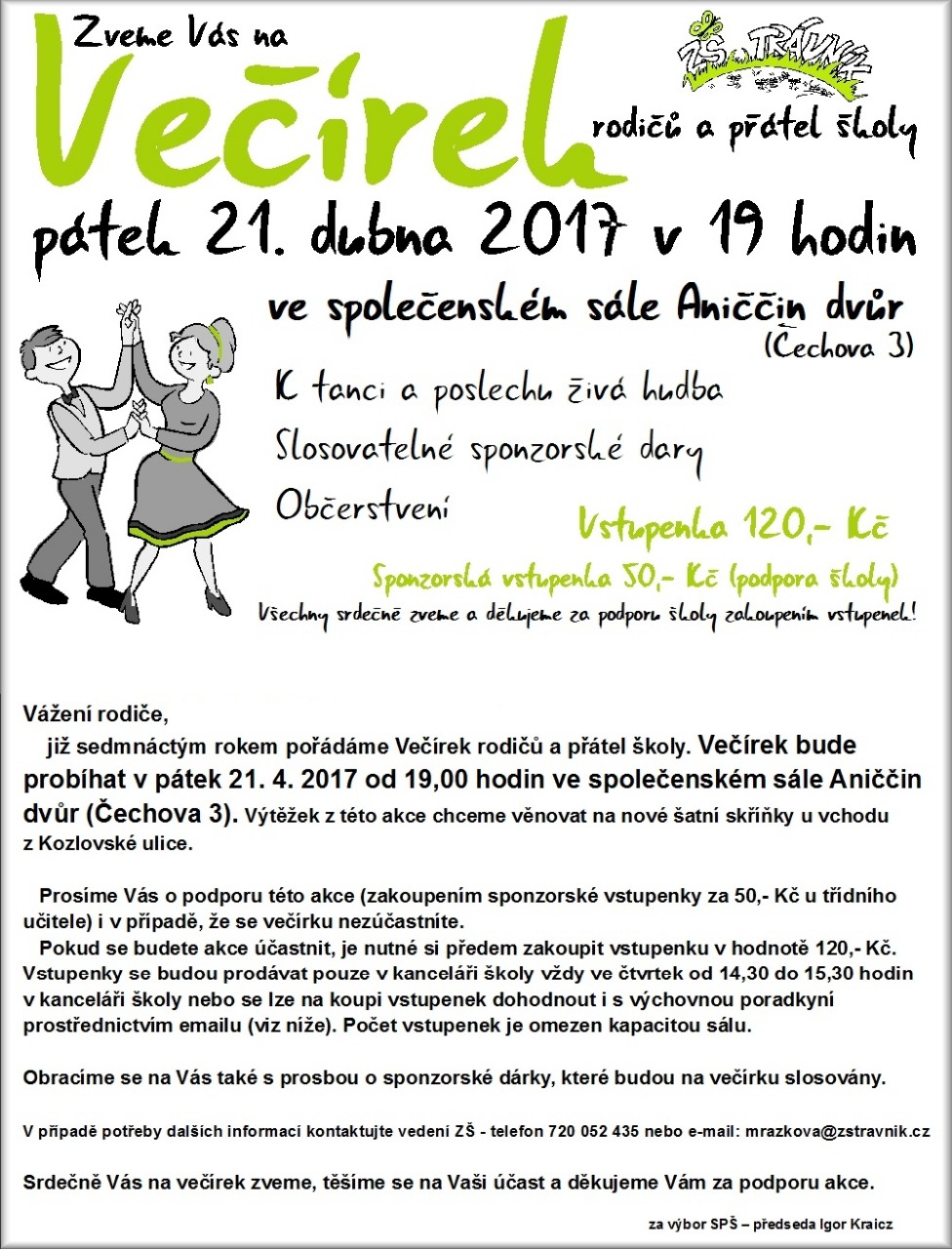 15.3.: Po dětech jsem Vám tento týden poslala informace k Reprezentačnímu plesu školy s návratkou. Děkuji moc všem, kteří se plesu zúčastní i těm, kteří se nezúčastní, ale zakoupili sponzorské vstupenky. Až vyberu peníze za sponzorské vstupenky od všech, kteří mají zájem, předám je p. uč. Mrázkové a pošlu Vám sponzorské vstupenky jako doklad o zaplacení.
